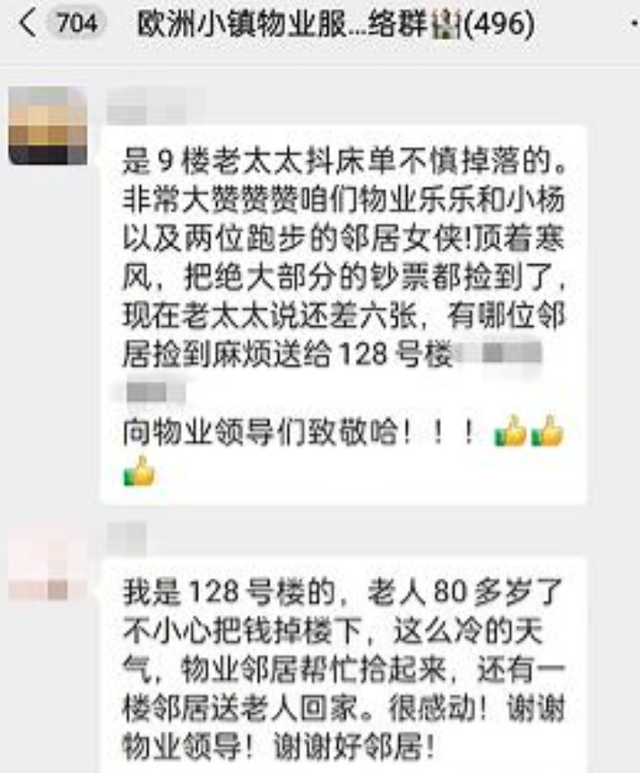 幸运的是,李玉湘及时向路过的邻居求助,邻居们听后都热心帮忙捡纸钞。同时,有邻居联系了物业管理人员小王,小王立即号召其他同事来到小区里进行搜寻,并在业主群里表明了李玉湘的情况,希望得到大家的帮助。