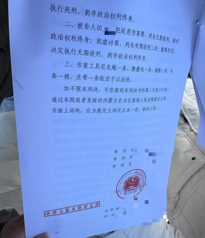 直到2024年12月6日,这场备受关注的案子才迎来高潮。呼伦贝尔中级人民法院的大法官敲响了法槌,宣布了判决结果:文某某因故意伤害罪和虐待罪,数罪并罚,被判死刑;田某某虽逃过死刑,但也被判无期徒刑。两人在庭上表示不上诉。