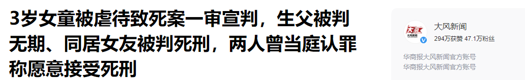 (信息来源:大风新闻 2024-12-06《3岁女童被虐待致死案一审宣判,生父被判无期、同居女友被判死刑,两人曾当庭认罪称愿意接受死刑》)