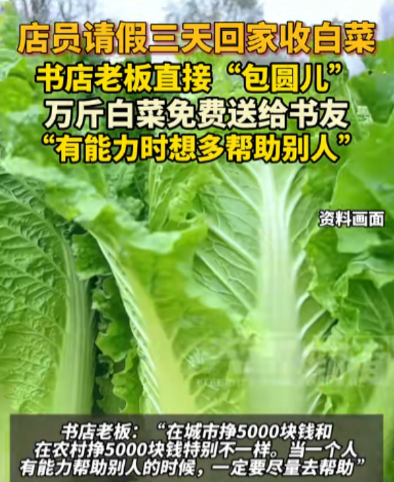 种白菜,远非想象中的简单,小黑知道,种一片好白菜,要从播种、施肥、除虫到收割,每一步都要仔细、耐心地去做。 尤其是每年在收获的季节,父母更是忙得不可开交,尽管如此,他们依然坚持不懈地劳作,望着一片片茂盛的白菜,眼里充满了期待和满足。 但是,所有的辛劳似乎都没能换来应得的回报,市场的价格不断压低,农民的辛苦几乎无人问津。 小黑家的白菜,这一季种了1万多斤,按每斤1毛5的收购价计算,也只能卖到1500元。 而这点钱,根本不足以支付雇工的费用,更别提剩下的各种生活开销了,尽管如此,父母还是不想着放弃。 小黑心里很清楚,家里的情况并不好,每次看到父母忙碌的身影,他的心情都很沉重,于是他拿起手机,将心里的不满与感慨发到了朋友圈。 那条朋友圈,写着:“种了一年的白菜,卖不上价,父母一天到晚忙得像陀螺,换来的却是这微薄的收入。希望这片土地能带来更多的希望。” 没想到,没过多久,书店老板王先生看到这条朋友圈,联系了小黑,提出要以5000元的价格,收购小黑家所有的白菜。 对于王老板来说,这笔钱虽然不算多,但在他看来,这既是对小黑家帮助,也是对自己店铺的一次社会责任的担当。 王老板笑着对小黑说:“你们辛辛苦苦种出来的白菜,卖不上好价钱,真的很让人心疼,我能做的,也许不多,但力所能及的帮助,至少能让你们感受到一点温暖。” 小黑听到这个消息时,感动得几乎说不出话来,他知道,这个老板并不是因为白菜的价格高,而是看到了自己家的困境,想要给予一些帮助。 王老板的举动让小黑的心中涌起了莫名的感动,他没有想到在这样的时代里,竟然会有人这么关心自己这样的小家庭。 更令小黑感动的是,王老板表示,他会将这批白菜作为赠品,送给书店的顾客。通过这样的方式,既帮助了他家度过眼前的困难,又让更多的人感受到社会的温暖。 王老板说道:“我在城市里挣5000块钱和农村的5000块钱完全不一样。虽然我不懂种地的辛苦,但我知道,农村的困境往往比城市的更加艰难。 我们每个人都有责任去帮助那些身处困境的人,哪怕只是微小的力量,也许能改变一个家庭的命运。” 小黑带着王老板的5000元回家时,父母一开始还不明白发生了什么。等到小黑把整个事情说清楚后,父母都感动得几乎落泪。 他们没想到,自己辛苦种出来的白菜,竟然能在这么短的时间里得到如此的帮助。这不仅仅是解决了眼前的经济困难,更让他们感受到了来自社会的温暖和希望。 信息来源:大象新闻,2024年12月5日(采访),山东济南,书店店员请假三天回老家收白菜。老板了解情况后,花5000元全部买下,免费送给书友。店员:菜贩子的收购价只有1毛多一斤,老板帮家里解决了很大问题