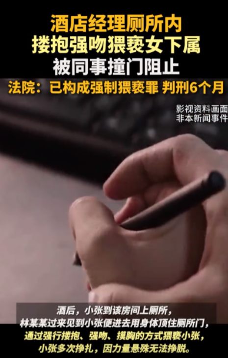 被判了!6月13日,广东一酒店经理在厕所内强行搂抱女下属,实施猥亵行为,好在女下属有同事的帮助解脱了酒店经理的性骚扰,现在,法院判的结果出来了!网友:“严惩不贷,6个月还是太少了。”