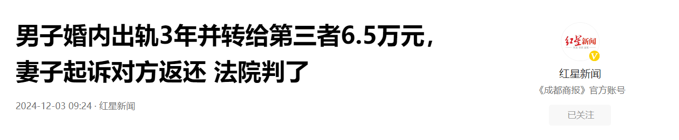(信息来源:红星新闻 2024年12月3日 《男子婚内出轨3年并转给第三者6.5万元,妻子起诉对方返还 法院判了》)