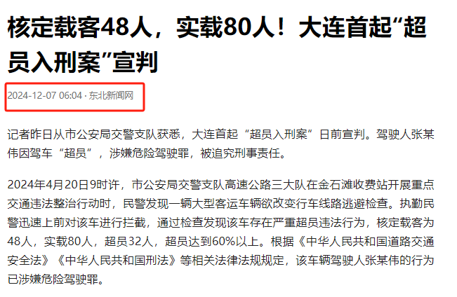 (信息来源:2024-12-07 ·东北新闻网《核定载客48人,实载80人!大连首起“超员入刑案”宣判》)
