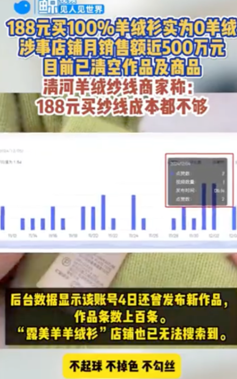 又一个行业“暴雷”!一男子花了188元买了一件“纯羊绒衫”,觉得不放心,送检后发现竟是100%羊毛!这家月销近500万的店铺,就是靠着虚假宣传赚得盆满钵满。网友:188连买纱线的成本都不够,怎么可能是羊绒?