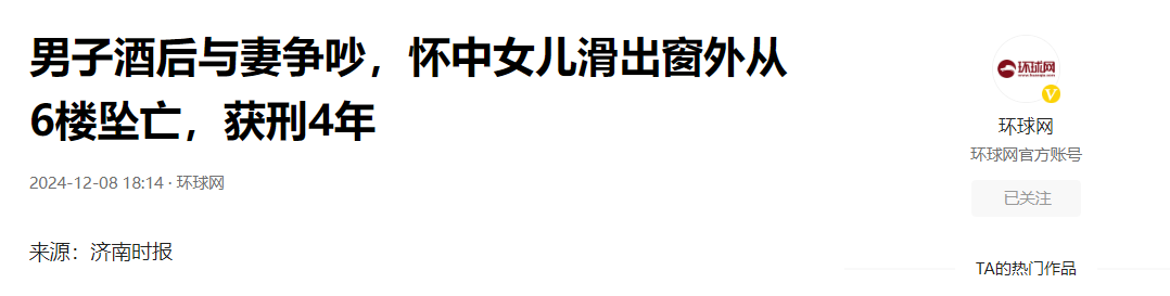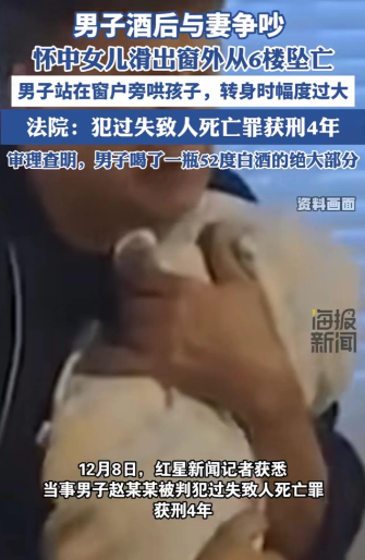 (信息来源:环球网 2024年12月8日关于《男子酒后与妻争吵,怀中女儿滑出窗外从6楼坠亡,犯过失致人死亡罪获刑4年》)
