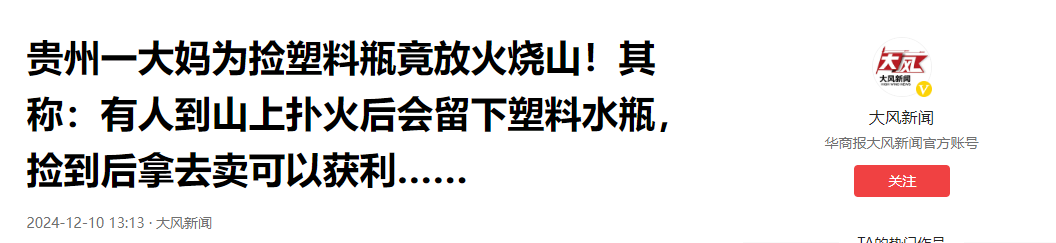 (信息来源:大风新闻 2024年12月10日 《贵州一大妈为捡塑料瓶竟放火烧山!其称:有人到山上扑火后会留下塑料水瓶,捡到后拿去卖可以获利……》)