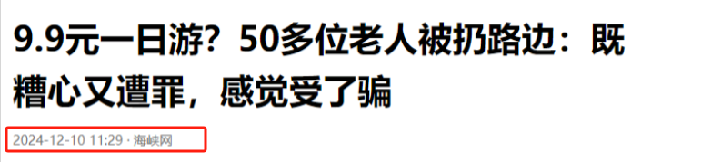 (信息来源:海峡网 2024年12月10日 《9.9元一日游?50多位老人被扔路边:既糟心又遭罪,感觉受了骗》)