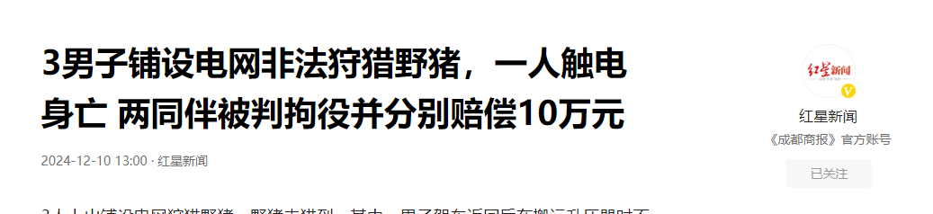 (信息来源:红星新闻 2024年12月10日 《3男子铺设电网非法狩猎野猪,一人触电身亡 两同伴被判拘役并分别赔偿10万元》)