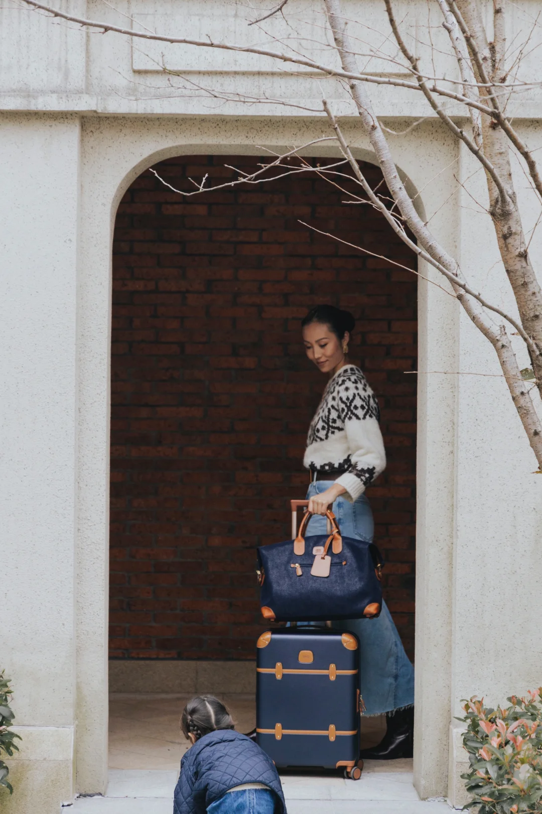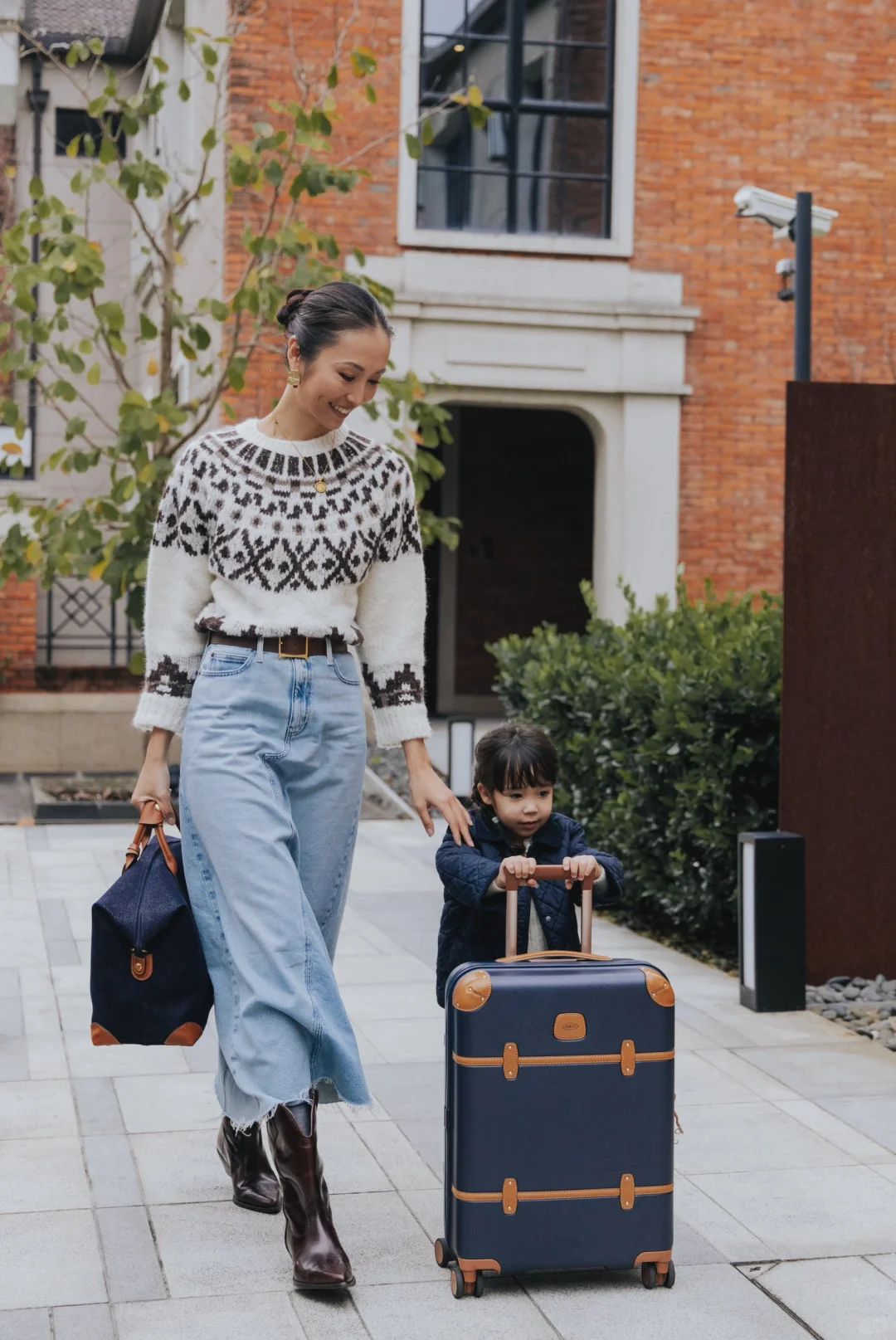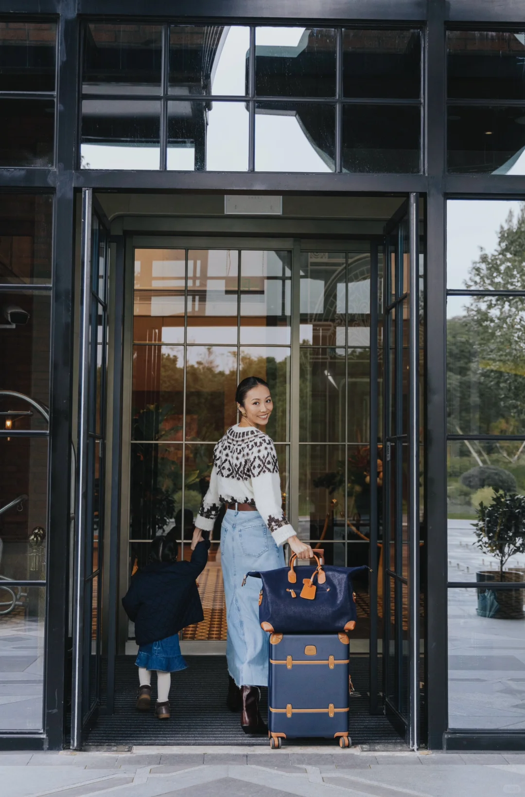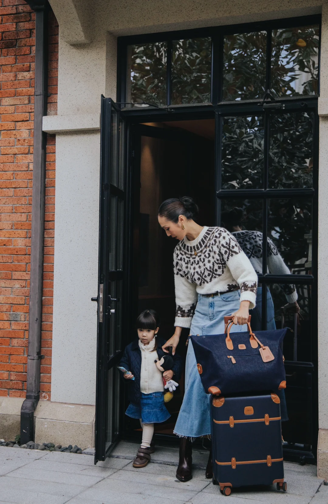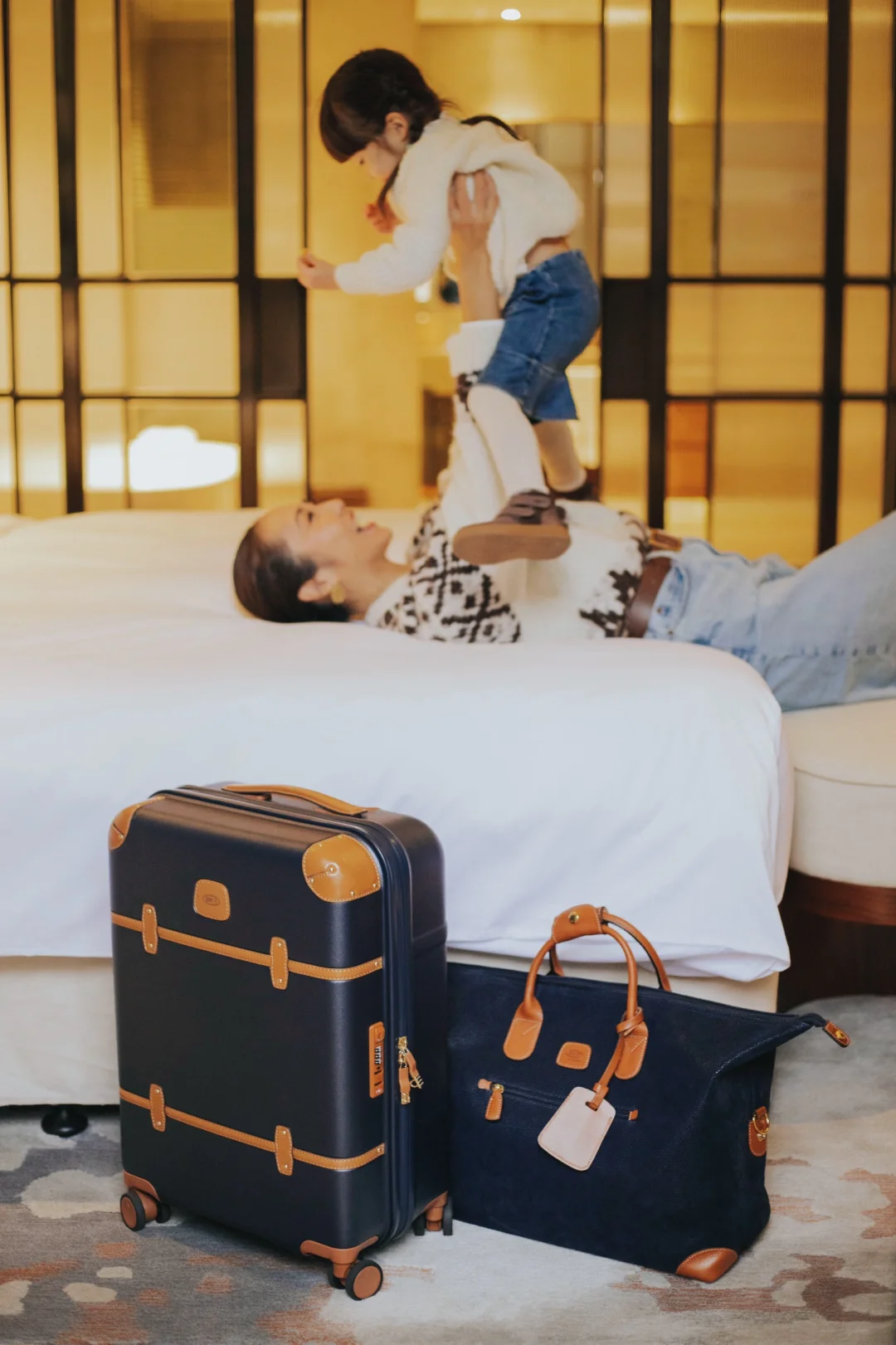 这次旅程,我们带上了Bric’s的经典Bellagio行李箱,搭配同色系旅行袋。复古又优雅的设计,自重又轻,让人一看就爱不释手,一路上Sienna都坚持自己推,箱子不仅颜值在线,实用性也拉满。容量大,轻松装下Sienna的玩具、外套,还有她的小米奇!特别是它轻便顺滑的万向轮设计,推着也毫不费力,轻松又优雅。