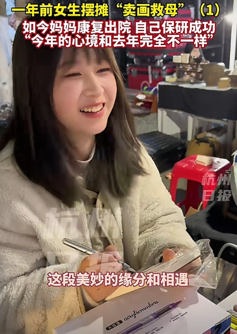 (信息来源:杭州日报;2024年12月11日《一年前女生摆摊“卖画教母”,妈妈已经康复出院,自己保研成功,今年的心境和去年完全不一样》)