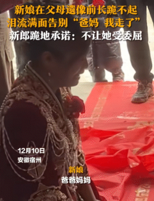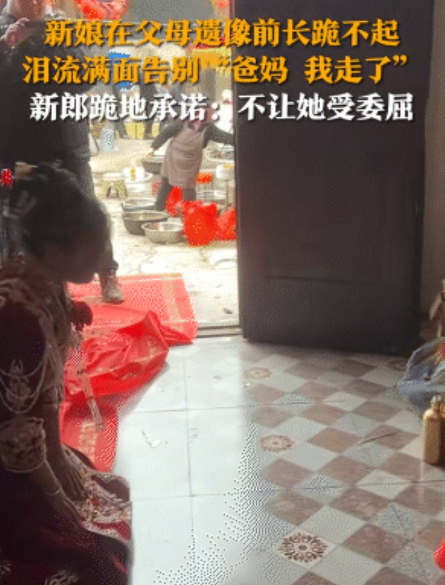 (信息来源:生活帮;2024年11月7日关于《新娘在父母遗像前长跪不起,泪流满面告别“爸妈,我走了”,新郎跪地承诺:不让她受委屈》的报道)