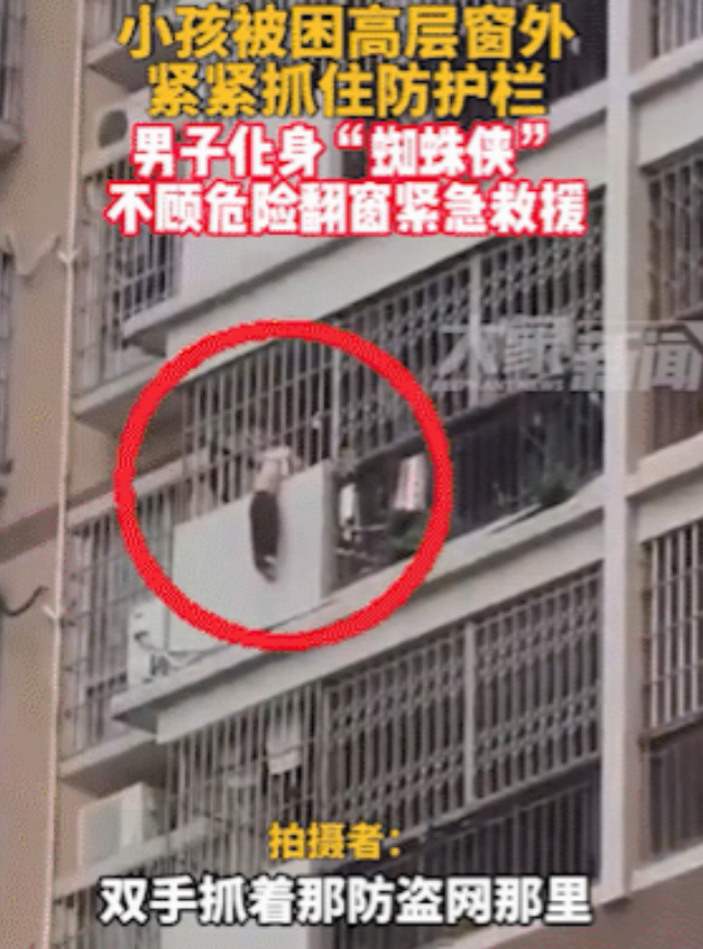 (信息来源:大象新闻;2024年12月12日关于《广西小孩被困高层窗外紧紧抓住防护栏,男子化身“蛛侠”不顾危险翻窗紧急救援》的报道)