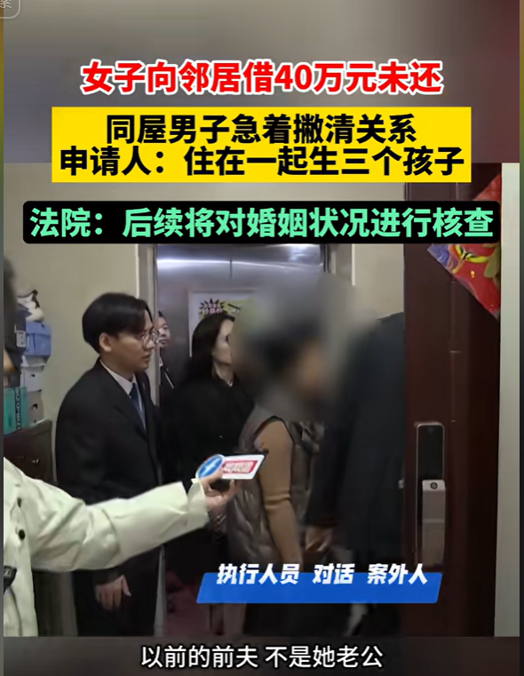 (信息来源:第一帮帮团2024年12月12日关于《女子向邻居借40万,同屋男子急着撇清关系,申请人:住在一起生三个孩子 法院:后续将对婚姻状况进行核查》、文中皆为化名)