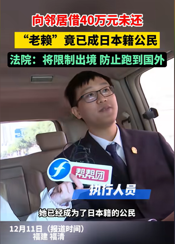典型耍无赖!福建福清,女子向邻居借40万不还,法院执行人员上门时,跟她同居好几年的老公却称他们没有婚姻关系,生的3个孩子也不是他的,极力撇清关系,更离谱的是,女子已经成为日本籍公民,法院紧急限制出境!