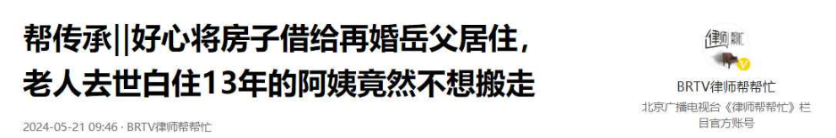 被白嫖了13年!上海一男子出于孝心,将自己一套房屋给岳父长期居住。后来,岳父再婚,再婚妻子和岳父在男子房屋内共同生活了13年。谁能想到,岳父走在了再婚妻子前面。男子看着后岳母也可怜,于是宽限她3个月找房子搬离,可后岳母不但不搬离,还换了门锁,男子无奈之下,将后岳母诉至法院!