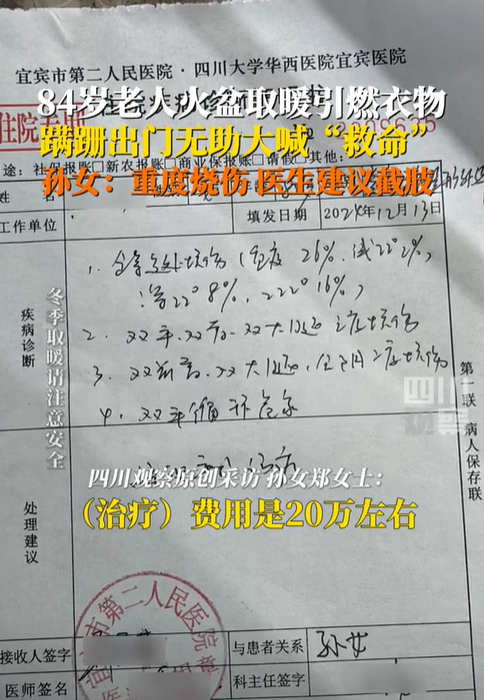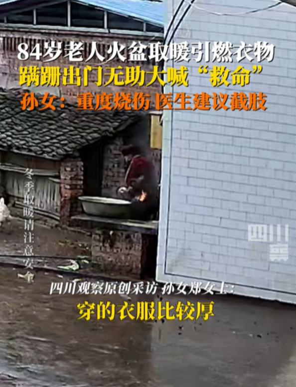 (信息来源:四川观察;2024年12月13日《84万老人火盆取暖引燃衣物,蹒跚出门无助大喊“救命”,孙女:重声烧伤,医生建议截肢》)