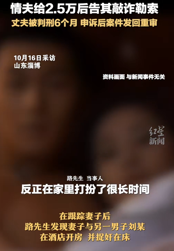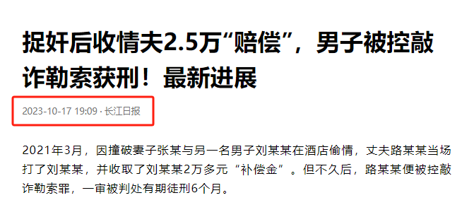 信息来源:2023-10-17 ·长江日报《捉奸后收情夫2.5万“赔偿”,男子被控敲诈勒索获刑!最新进展》
