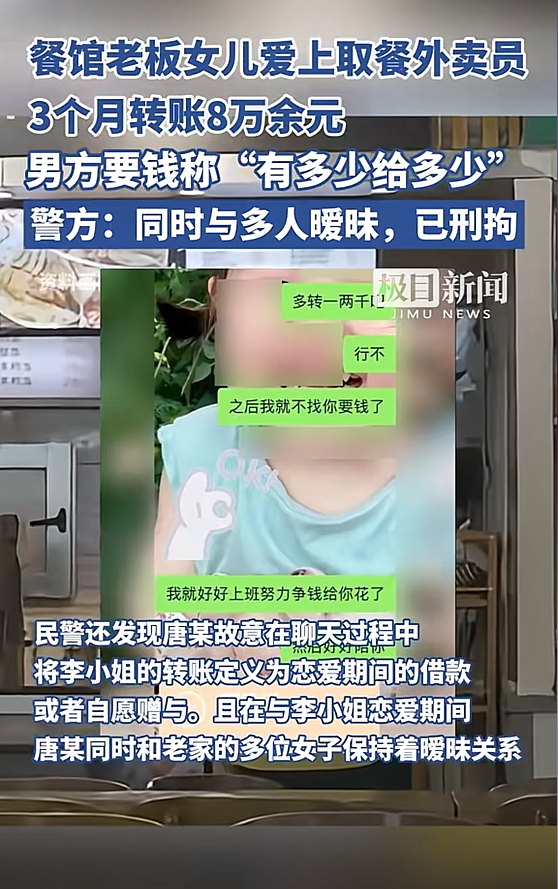(信息来源:极目新闻2024年12月13日关于《餐馆老板女儿爱上取餐外卖员,3个月转账8万!警方:他同时和多人暧昧,已刑拘》的报道)