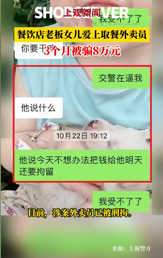 人渣!上海,单纯的餐饮店老板女儿爱上外卖小哥,万没想到,恋爱期间小哥多次问她要钱,还说“有多少转多少”。仅3个月后,女子转给他80000余元,老板报警了!