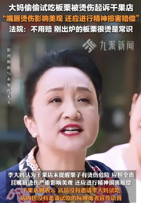 “碰瓷碰出新高度!”北京,一大妈外出购物,路过一干果店时看到店家正在做糖炒栗子,趁店员不注意,大妈直接拿起一个栗子就塞进了嘴里,谁知却被栗子烫伤了嘴。大妈认为这是干果店的责任,于是将老板告上法庭要求索赔,法院判了!