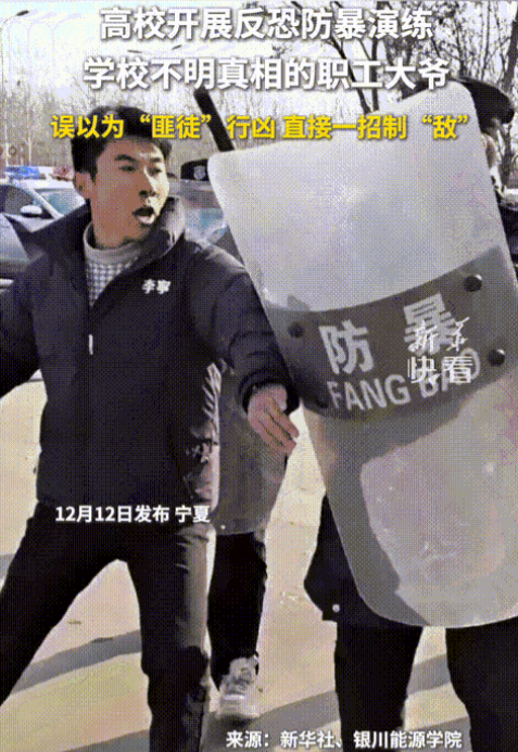 12月12日,宁夏银川能源学院举办了一场防爆演练,旨在提升安保团队的应急处理能力。学生小马主动请缨,扮演起了“歹徒”角色,手握道具大砍刀。