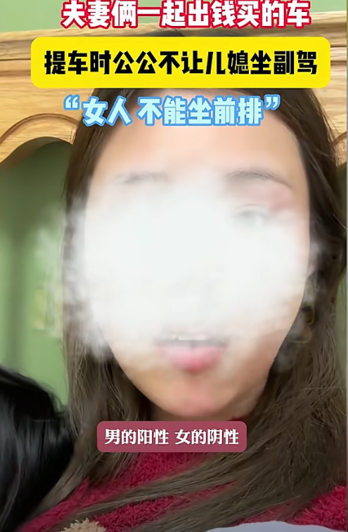 凭什么不让坐副驾驶!上海,夫妻俩一起出钱买的车,和丈夫一块去提车时,女子被公公告知“女人不能坐副驾”。公公的一番说辞,让女子瞬间无言以对。