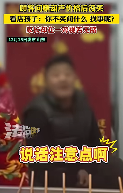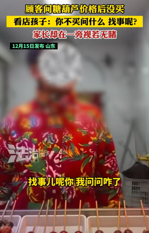 (信息来源:法治进行时2024年12月16日关于《顾客问糖葫芦价格后没买,看店孩子:你不买问什么,找事呢?家长却在一旁视若无睹》的报道)