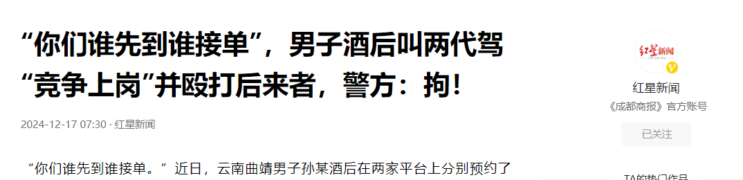 (信息来源:红星新闻 2024年12月17日 《“你们谁先到谁接单”,男子酒后叫两代驾“竞争上岗”并殴打后来者,警方:拘!》)