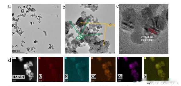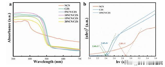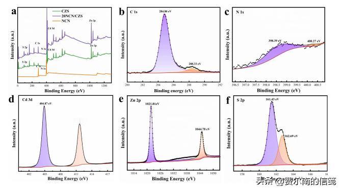 复合构建异质结研究现状与研究方法 由于g-C3N4特殊的二维层状结构基体可以与其他半导体进行复合构建异质结。   在众多半导体材料中,CdxZn1-xS三元固溶体具有优异的光催化活性以及良好的稳定性,并且能带结构与g-C3N4相匹配。   因此近年来报道了许多关于g-C3N4/CdZnS复合材料用于光催化分解水制氢的文献[91-94]。   本章通过10NCN/CZS和10CN/CZS的光催化产氢速率对比,证明了氮掺杂石墨碳能够进一步提高了复合材料的光催化产氢活性。   本章系统的分析了样品的微观结构、产氢活性以及光电特性等,探究了NCN/CZS复合材料中光生载流子的转移路径和光催化活性增强的机制。   采用传统的高温固相法制备了g-C3N4和NCN[83]。   具体方法如下:首先使用分析天平称量20g尿素和20mg柠檬酸一水合物,然后将其称量后的前体混合均匀后放入带盖的坩埚中,随即转移至马弗炉中进行煅烧。   以2℃·min-1的速率升温至550℃,保温4小时,然后随炉冷却至室温,最后将得到产物标记为NCN。   g-C3N4的制备方法除了未添加柠檬酸一水合物外,其余方法步骤上述一致。   通过一步水热合成法成功制备了NCN/CZS复合光催化剂。   在先前的文献报告中,研究人员发现,当CdxZn1-xS中Cd和Zn的摩尔比例为1:1时,具有最佳的光催化活性[50],因此我们选择Cd0.5Zn0.5S作为复合材料的主体部分。   其具体步骤如下:首先用分析天平称量0.0726gNCN(NCN与CZS的质量比为10wt.%),0.79959gCd(Ac)2∙2H2O和0.65853gZn(Ac)2∙2H2O,将其溶解于装有30mL去离子水的烧杯中,然后用分析天平称量2.16gNa2S∙9H2O溶解于另外一个装有30mL去离子水的烧杯,将两个烧杯放置于磁力搅拌器上,分别搅拌一个小时后,然后将两者倒入一个100mL烧杯中继续搅拌一个小时,使其混合均匀,然后转移至100mL的反应釜内衬中,拧紧水热反应釜的盖子,将其放入鼓风干燥箱中进行水热反应,其中水热反应温度为180℃,反应时间为24小时,待反应釜冷却至室温后,用胶头滴管吸出上层清液,并用去离子水和无水乙醇进行洗涤离心。   将洗涤离心后的产物放置于60℃的烘箱中过夜,将烘干后得到的产物命名为10NCN/CZS。   按照上述相同的合成方法,仅改变NCN的质量,制备得到了一系列的xNCN/CZS复合材料(x=5,15,20),其中将不添加NCN得到的产物命名为CZS。   将其NCN替换为g-C3N4,质量都为0.0726g,其余制备步骤保持不变,得到的产物命名为10CN/CZS。   综上所述,NCN/CZS复合材料的制备方法如图3-1所示,利用XRD分析了所制备样品的晶体结构和结晶度。   其测试结果如图3-2所示,在g-C3N4的XRD图中可以观察到在12.8°和27.6°处的特征峰分别对应石墨相氮化碳(PDF871526)的(100)和(002)晶面[95,96]。   NCN的XRD特征衍射峰与g-C3N4相比未发生明显的变化,基本保持一致,这说明加入微量的柠檬酸并没有改变原始g-C3N4的分子结构和框架。   在CZS的XRD图中可以观察到其主要衍射峰在25.5°、26.9°、28.3°、44.7°、47.0°、52.9°和55.8°处,他们分别与六方晶系硫化锌镉的(100)、(002)、(101)、(110)、(103)、(112)和(201)晶面相吻合,25.5°处的特征峰较弱,这在之前的文献中也有报道[97]。   对于NCN/CZS的XRD图谱,由于CZS与NCN两者位于(002)晶面的衍射峰重叠,且NCN的12.8°处的特征峰比较微弱,不能发现其他额外的NCN特征峰。   本章通过简单的两步法(高温固相法和水热合成法),成功将CZS纳米颗粒负载在二维片层状NCN的表面。   在可见光的照射下,10NCN/CZS的光催化产氢速率达到56.35mmol·h-1·g-1,分别为原始NCN(0.21mmol·h-1·g-1)的268倍和CZS(27.98mmol·h-1·g-1)的2.01倍,而且也高于10CN/CZS(50.10mmol·h-1·g-1),且在420nm单色光下的表观量子产率(AQY)达到10.07%,同时具有较好的稳定性。