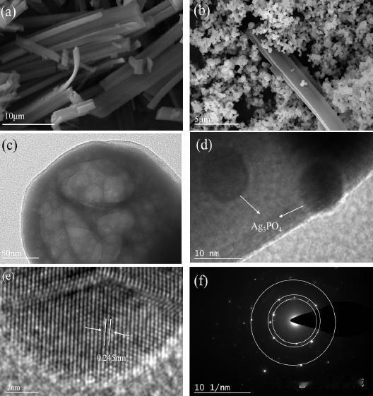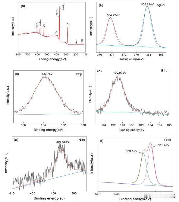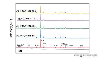 利用PBN的优秀性,提高Ag3PO4材料光催化性能 与其他二维材料相比,PBN在光催化领域研究利用较少,利用PBN的优秀性能提高Ag3PO4材料光催化性能的研究更为少见,所以研究PBN与Ag3PO4结合提高光催化性能十分必要。 本章使用原位沉积法,将磷酸银沉积在PBN上,制备出Ag3PO4/PBN复合光催化剂,对Ag3PO4/PBN复合光催化剂的晶型、形貌、光学性质等进行测试、表征,在可见光照射下,以RhB降解效果来评价Ag3PO4/PBN可见光催化活性及光催化降解机理。 图4-1为Ag3PO4、PBN和PBN/Ag3PO4-70复合材料的红外光谱。 在PBN的FTIR图谱中,1382cm-1和796cm-1处附近的特征吸收带,分别来源于B-N键的伸缩振动与B-N-B平面外的弯曲振动。 Ag3PO4/PBN-70复合材料的FTIR谱图中出现了两种组分的特征吸收峰,680cm-1处出现P-O反对称伸缩振动,证明有Ag3PO4的存在。 这充分说明Ag3PO4/PBN异质结构的成功制备,图4-2为PBN,Ag3PO4以及不同配比的PBN/Ag3PO4复合材料的X射线衍射谱图。 制备的PBN在2θ=25.9°处存在一个比较宽的衍射峰,与六方氮化硼的标准卡数据(JCPDS卡号:85-1068)进行比对,对应PBN的(002)晶面。 衍射峰没有杂峰,高而尖锐,说明制备的Ag3PO4有较高结晶性,Ag3PO4/PBN复合材料的衍射峰和纯Ag3PO4的锋位置基本重合,并没有发现明显的PBN衍射峰。 因此,Ag3PO4和PBN两种材料可以相互复合,制得结构、性质稳定的复合材料,图4-3a为PBN、Ag3PO4和不同PBN含量的Ag3PO4/PBN的紫外可见漫反射(UV-visDRS)谱图。 由图可知,PBN的吸收边缘在330nm左右的紫外光,Ag3PO4的吸收边缘在530nm左右的可见光,Ag3PO4/PBN复合材料的吸收光谱和带隙能量与Ag3PO4的相似。 但是光吸收强度随着PBN质量的增加而减小,这是因为PBN的带隙宽度较宽,并不会吸收530nm的可见光,在Ag3PO4/PBN中Ag3PO4,PBN含量逐渐变大,导致其光吸收强度减小。 PBN、Ag3PO4和Ag3PO4/PBN-70的导价带宽度通过UV-visDRS数据计算,以hv为横坐标,(αhv)2为纵坐标得到图4-3b,计算得到PBN、Ag3PO4和Ag3PO4/PBN-70的禁带宽度分别为+3.75eV,+2.35eV和+2.26eV,在根据λ=1240/hv,Ag3PO4/PBN-70对应的吸收波长为548nm,说明Ag3PO4/PBN-70可以吸收548nm以下的可见光。 以上结果表明,Ag3PO4/PBN-70具有更小的带隙宽度,更宽的光谱响应,具有更强的光催化活性,采用XPS对制备Ag3PO4/PBN样品的化学状态进行了研究。 XPS光谱显示Ag、P、O、N、B元素的光电子峰(图3-4a),其中Ag、P、O来自于Ag3PO4,N和B来自于PBN。 图4-4b-f显示了复合材料中Ag、P、N、P、O的特征曲线,在图4-4b中,Ag3d的电子结合能出现在374.22eV和368.23eV两处,分别归因于Ag3d3/2和Ag3d5/2,表明材料中的Ag以Ag+的形式存在。 图4-4c中,P2pXPS光谱在133.7eV处显示出单个宽峰,说明材料中的P以P5+的形式存在。 在图4-4d中,B1s谱中190.87eV处存在一特征峰,说明复合材料中存在B-N键,在图4-4e中,N1s在398.05eV处出现一特征峰,可对应于N-B键,说明材料中存在PBN。 图4-4f中,531.2eV和533.1eV的信号峰分别由复合材料中的晶格氧和羟基氧的O1s产生,这些可证明成功制备了Ag3PO4/PBN复合材料。 本章通过FT-IR图谱分析、XPS、SEM和TEM实验结果表明Ag3PO4被均匀负载在PBN表面, PL图谱分析发现Ag3PO4/PBN复合材料中光生电子和空穴的复合得到了抑制,从而提高其光催化活性。 通过捕获实验发现:·OH、h+和·O2-是Ag3PO4/PBN复合催化剂在催化过程中的活性物质, 在光催化降解过程中PBN可以有效捕获Ag3PO4产生的光生电子,降低光生电子-空穴对负荷率从而使得Ag3PO4/PBN具有高催化活性。