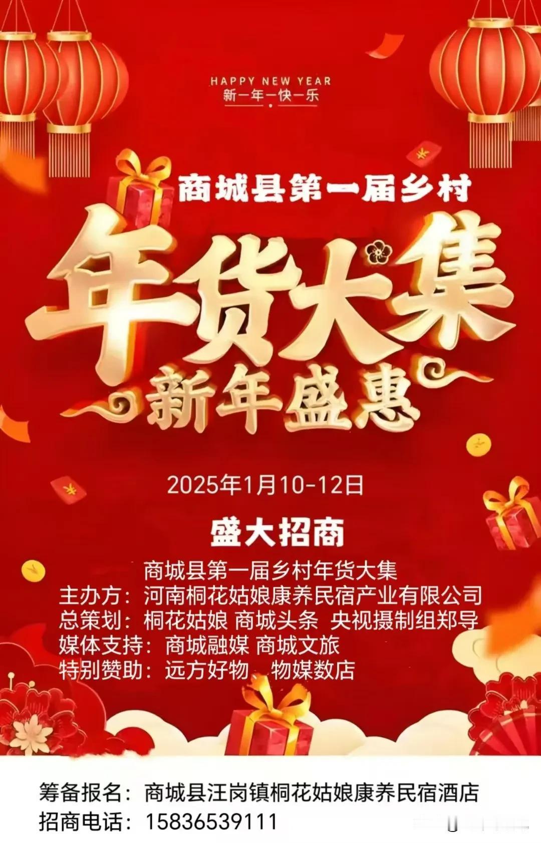 信阳头条:随着春节的临近,商城县第一届乡村年货大集于元月10日在汪岗镇举办! 为满足广大市民的购物需求,提供了物美价廉的年货,为商户展销搭建了相互交流的平台。实现了特优农产品、保健品、各种美食直销进大集,不仅为居民带来了安全实惠,还促进了城乡融合发展。 本届年货节由央视摄制组郑导策划;桐花姑娘康养民宿产业有限公司总经理杨静主办;桐花姑娘、商城头条、商城融媒、商城文旅大力支持;远方好物、物媒数店特别赞助。届时欢迎社会各界人士光临体验。
