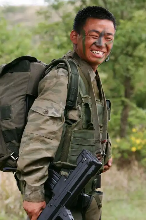 王宝强饰演的许三多剧照,憨笑中透着执着。《士兵突击》讲述许三多从农村傻小子成长为特种兵的励志故事。拍摄时,王宝强为许三多的单纯质朴、坚毅执着下足功夫。剧中没有爱情线,却用战友间的情谊、成长的磨砺打动观众,成为军旅题材经典,激励无数青年投身军旅。