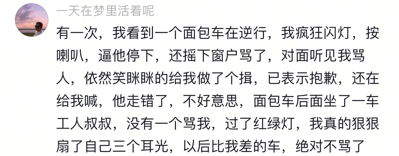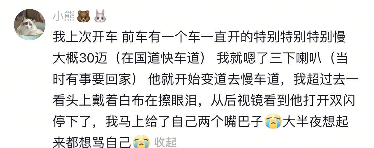 我前面有个车在路上蜗牛爬,我闪闪了他一路还按喇叭,等我超过去一看他在哄孩子,当时天就塌了