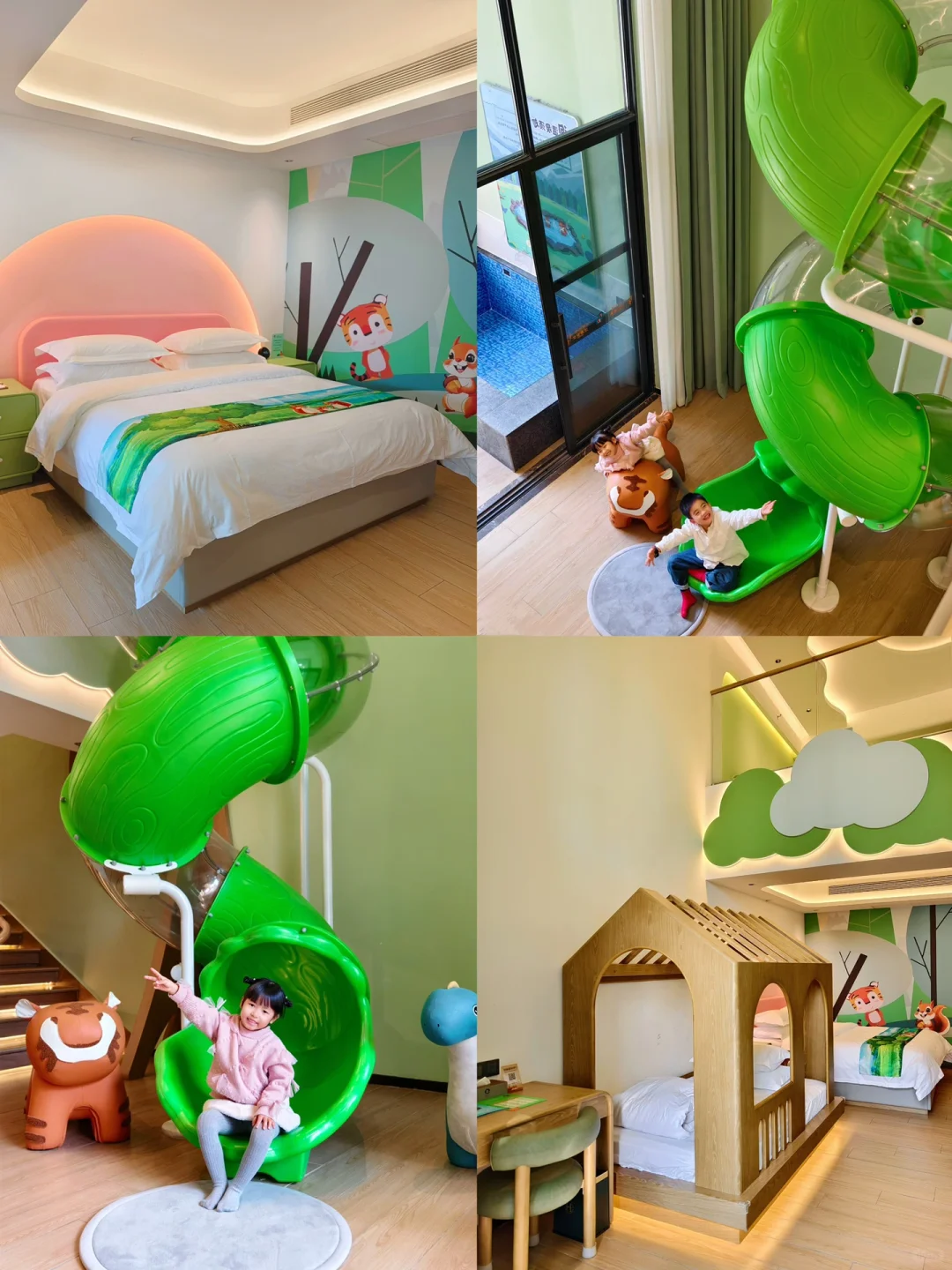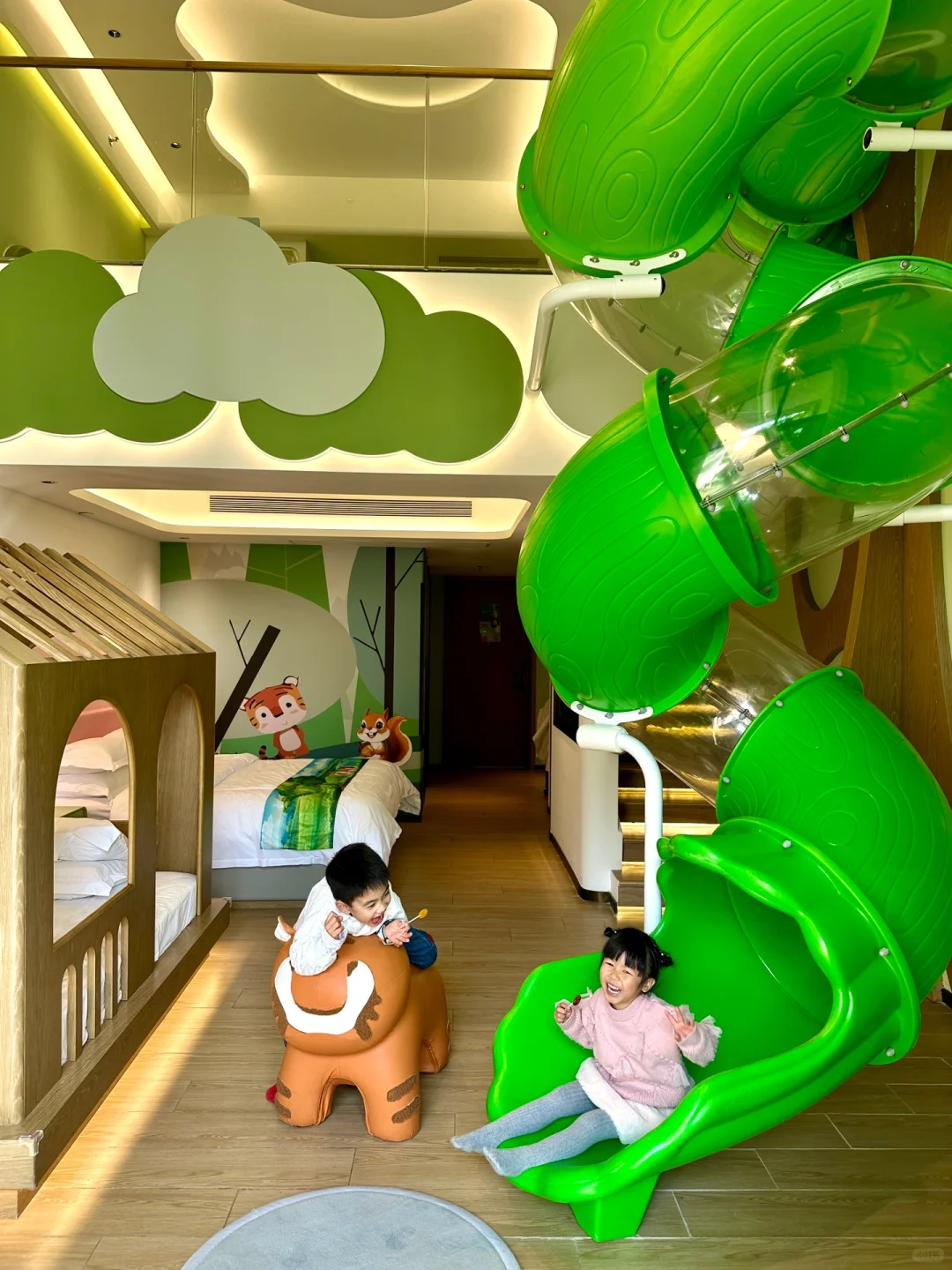 入住了森林复式亲子房,童趣配色,太好看啦!房间就有滑梯、小庭院泡池♨️度假氛围感直接拉🈵️