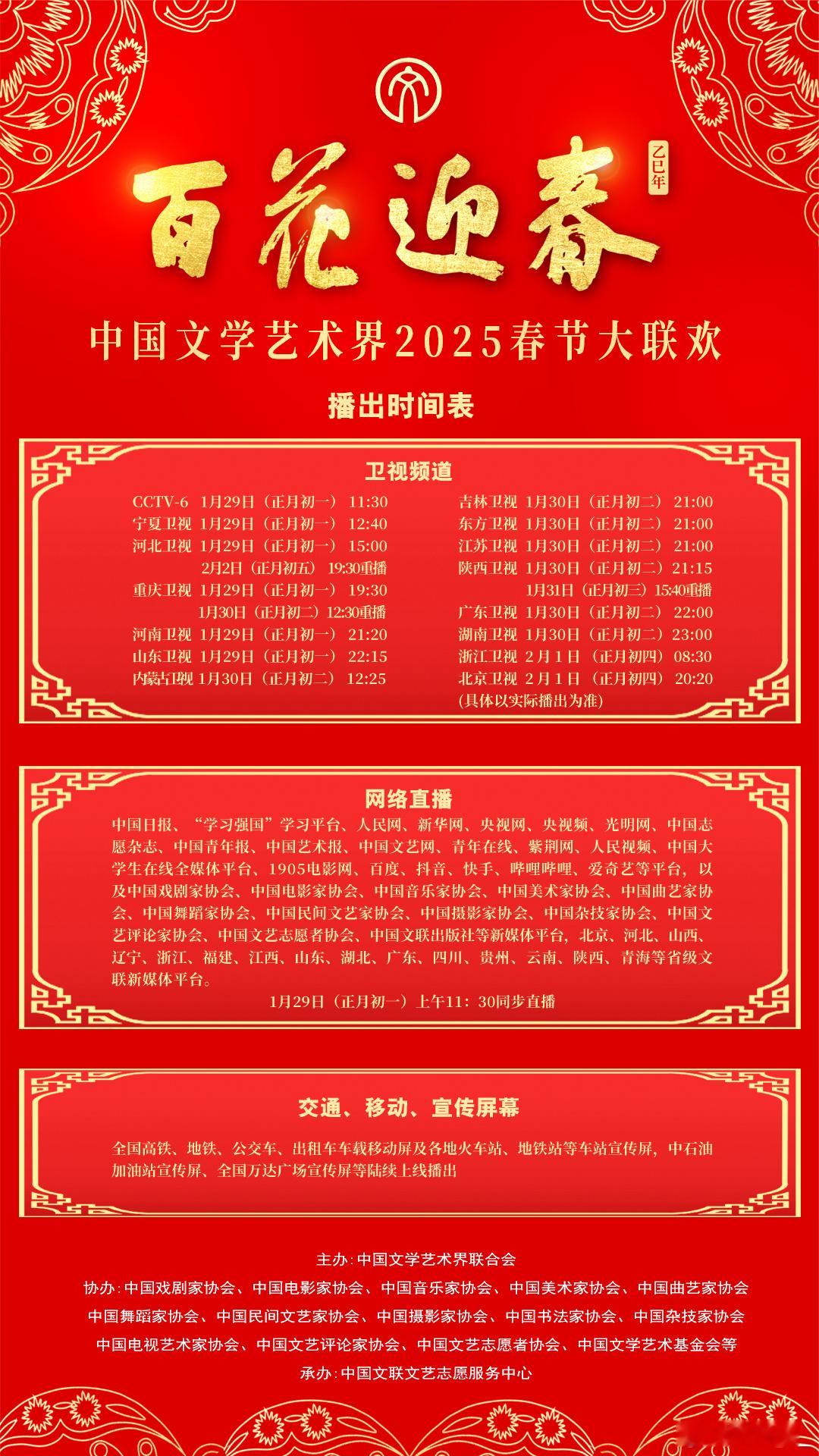 2025百花迎春 共唱团圆家,百花再出发。1月29日,“百花迎春——中国文学艺术界2025春节大联欢”正式播出, 与您一起欢欢喜喜过大年!