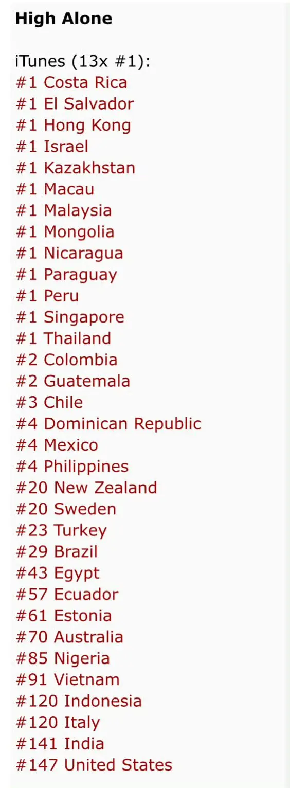 🔥🔥🔥。新歌《HIGH ALONE》首日上线空降全球iTunes歌曲榜单中第2️⃣3️⃣位❤️🔥 各地区榜单再更新🔥 1️⃣3️⃣个国家和地区的iTunes第1️⃣位🏆 哥斯达黎加、萨尔瓦多、中国香港、以色列、哈萨克斯坦、中国澳门、马来西亚、蒙古、尼加拉瓜、巴拉圭、秘鲁、新加坡、泰国 cr.小宣