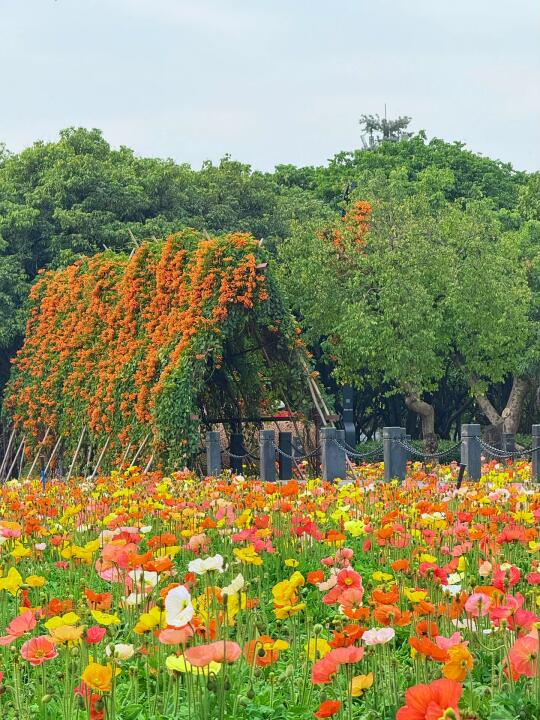 从北门进,穿过牌坊后往右手边➡️步行路线【湿地牌坊-绿心湖-花溪-飞龙桥-都市田园】就能看到一片花海!🌼PS:今年【福寿果廊】维修中,虞美人花海在【都市果园】‼️2.14替姐妹们看过了🤣湿地公园的紫荆花还没开哦~目前只有虞美人🉑看!