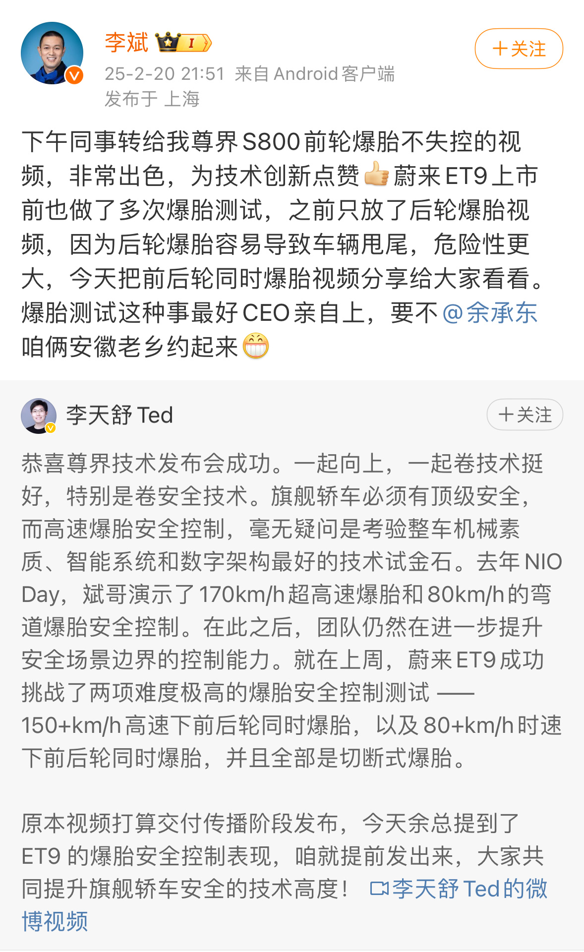 余承东邀请李斌来尊界发布会 昨天尊界发布会让友商也震撼到了,再一次看到了车圈的大团结,这样多好,你争我赶,共同进步。