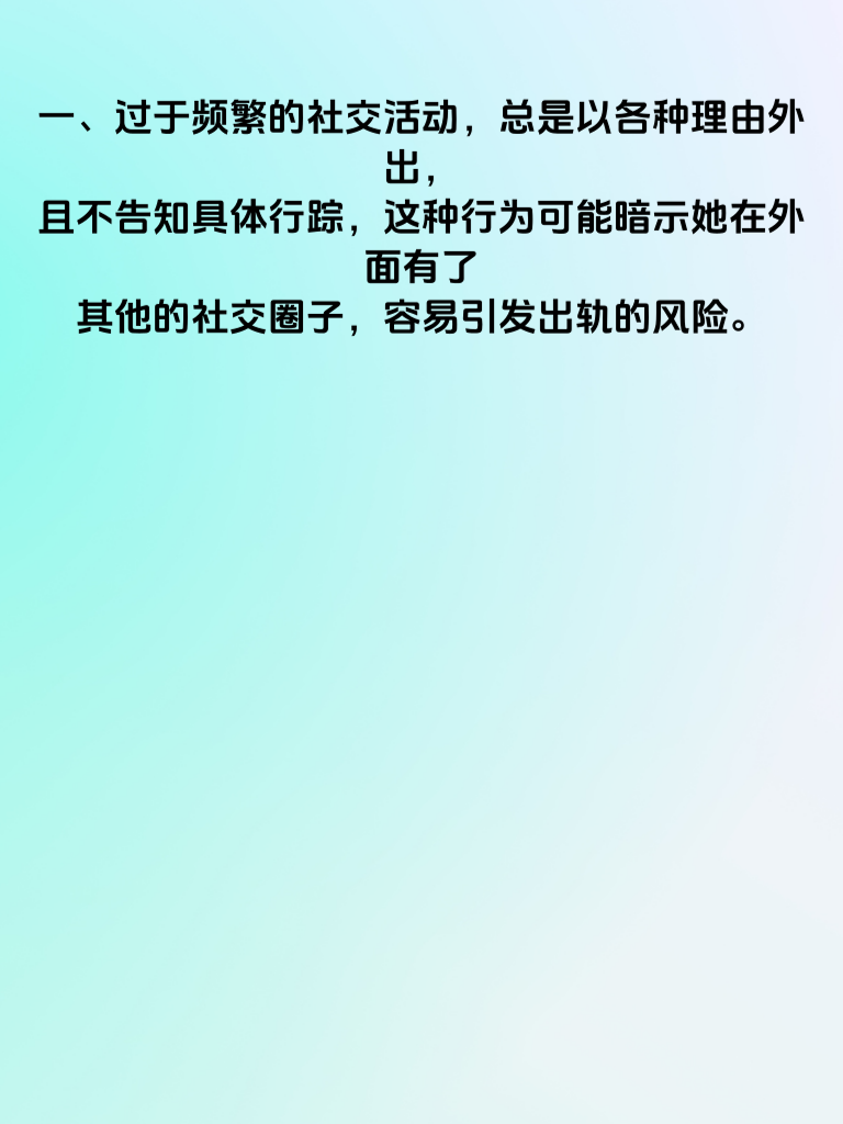 一、过于频繁的社交活动,总是以各种理由外出,且不告知具体行踪,这种行为可能暗示她在外面有了其他的社交圈子,容易引发出轨的风险。 二、对自己的形象突然格外在意,花费大量时间在打扮上,甚至开始注重一些平时不会关注的细节,这可能是她想要吸引他人目光的表现,有出轨的倾向。 三、对待你的态度发生明显变化,从之前的温柔体贴变得冷漠疏离,或者开始频繁与你争吵,这可能是她心有所属的信号。 四、突然对经济方面变得敏感,开始在意家庭的收支情况,或者频繁向你索要钱财,这种行为可能是她在为出轨做准备,需要引起重视。