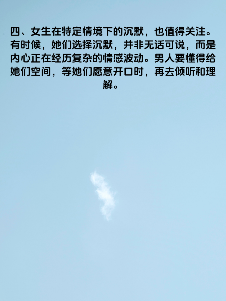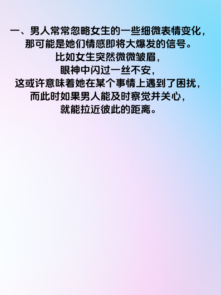 一、男人常常忽略女生的一些细微表情变化,那可能是她们情感即将大爆发的信号。比如女生突然微微皱眉,眼神中闪过一丝不安,这或许意味着她在某个事情上遇到了困扰,而此时如果男人能及时察觉并关心,就能拉近彼此的距离。 二、女生不经意间的肢体动作也不可忽视,像轻轻咬嘴唇、摆弄衣角等,这些小动作往往反映出她们内心的紧张或不安。男人若能留意到并给予安抚,会让女生感受到被重视。 三、女生说话的语气和用词也能透露情感状态,若是语气变得有些生硬或者用词开始带有情绪化,那可能是她的情感在逐渐升温或冷却。男人要敏锐地捕捉这些细节,做出恰当的反应。 四、女生在特定情境下的沉默也值得关注,有时候她们选择沉默并非无话可说,而是内心正在经历复杂的情感波动。男人要懂得给她们空间,等她们愿意开口时再去倾听和理解。