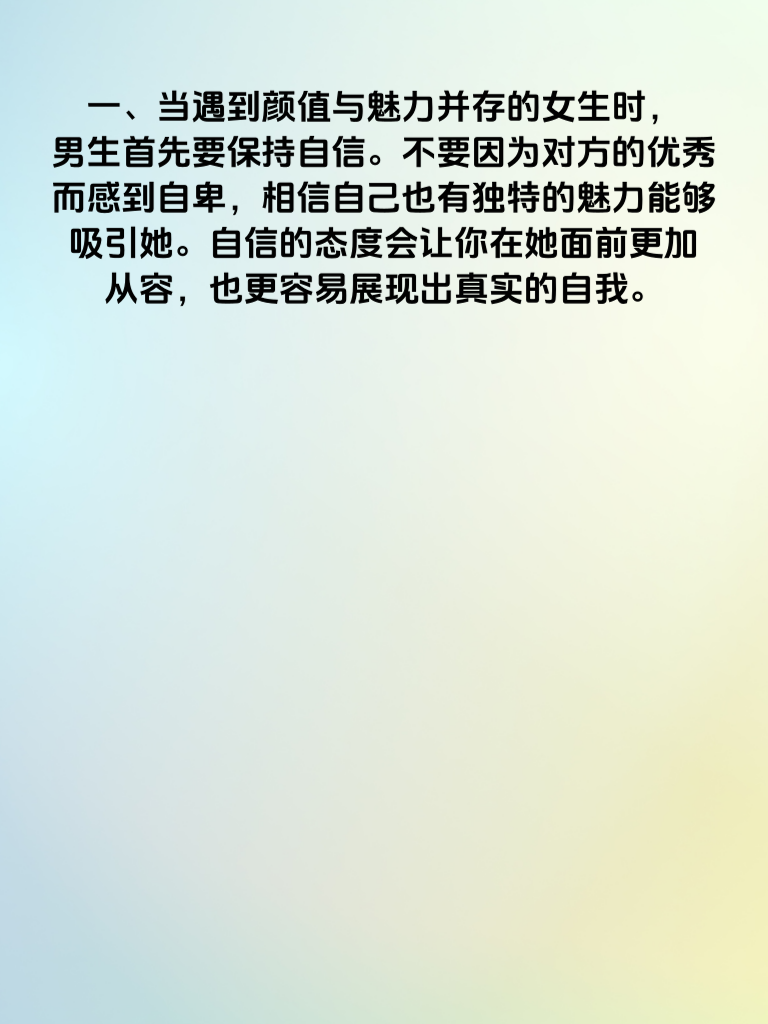 一、当遇到颜值与魅力并存的女生时,男生首先要保持自信。不要因为对方的优秀而感到自卑,相信自己也有独特的魅力能够吸引她。自信的态度会让你在她面前更加从容,也更容易展现出真实的自我。 二、学会欣赏她的优点。不要只看到她的外在美,更要发现她内在的闪光点,如善良、聪明、勇敢等。用欣赏的眼光去看待她,会让她感受到你的真诚和尊重。 三、提升自己的内在修养。颜值只是一时的,而内在的魅力才是长久的。男生可以通过阅读、学习等方式提升自己的知识储备和文化素养,让自己变得更加有内涵。 四、主动与她交流。不要害怕主动接近她,勇敢地迈出第一步。可以从一些共同的兴趣爱好入手,展开话题,逐渐拉近彼此的距离。在交流中展现出自己的幽默和风趣,会让她对你产生好感。