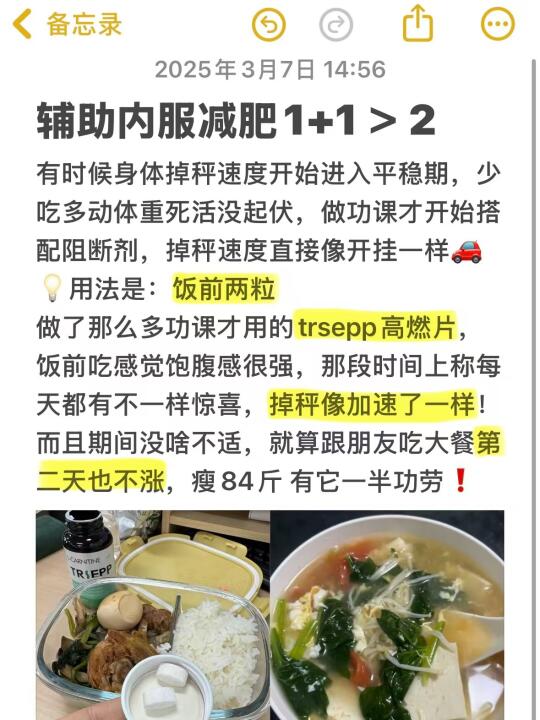 📌辅助掉秤我会搭配阻断剂,因为我发现长期吃了以后,身体掉秤速度开始平稳,后面发现用阻断剂后掉秤速度1+1>2,不禁让我惊喜! 做了很多功课开始用Trsepp高燃片,当时是被它成分温和种草的,没想到搭配起来,掉秤效果这么猛!饭前吃2粒,感觉很有饱腹感,食欲也变小了点,每天上称的时候都有惊喜哈哈,而且就算偶尔嘴馋了跟朋友吃美食的时候,第二天也不涨!是我减肥期间的一个好帮手。
