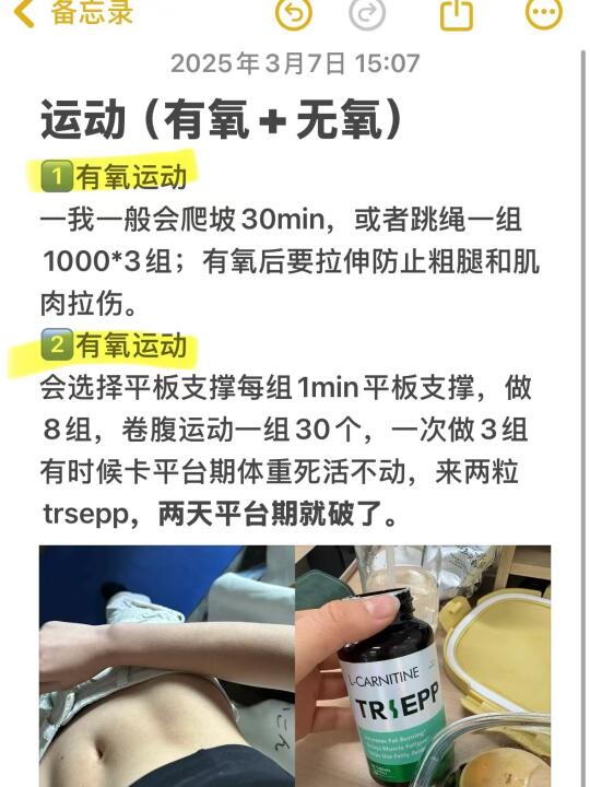 ✨有氧运动 一周三次有氧,我一般会爬坡30min,或者跳绳一组1000*3组;有氧后要拉伸防止粗腿和肌肉拉伤。 有时候运动期间卡平台体重死活不动,我还也会用trsepp,没两天平台期就破了。