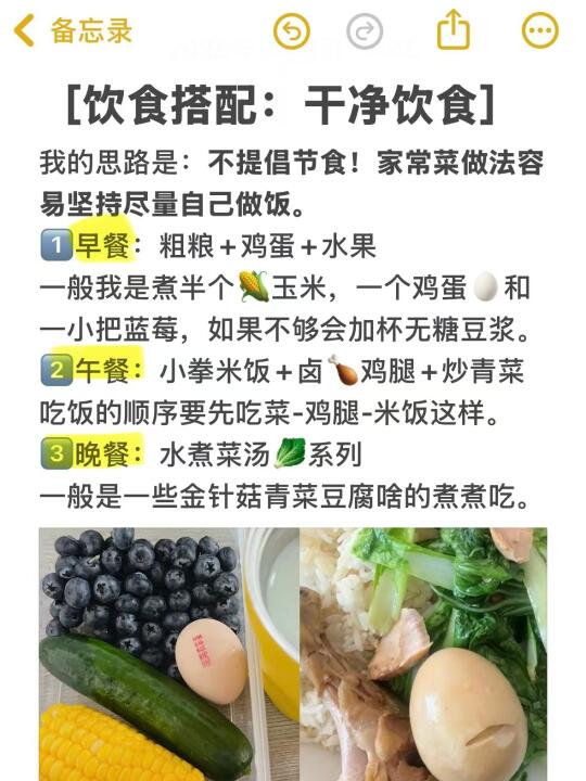 ✨详细的一日三餐我放在图上了,简单来说就是一些普通的家常菜,不仅干净而且健康,也要注意营养搭配,这样会比节食管住嘴更容易坚持!