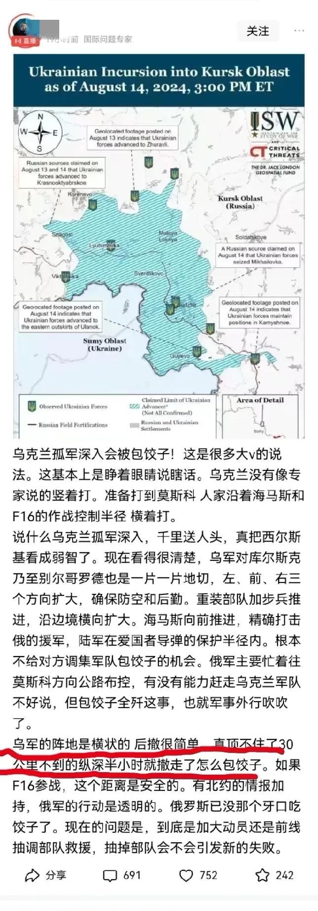 乌克兰的铁人越野突围大体分为35公里,30公里,20公里这三个级别,在库尔斯克州被俄军包饺子区域,算越野+公路,至于是轻装和负重得看他们自己选了,最终安全区域应该是苏梅州——库尔斯克州的R200公路。 对了,有粉丝估算了一下五千人的队伍,分乘300多辆运载卡车,按照每15秒一辆通过高速公路,在没有敌袭的情况下,全部开上高速公路需要75分钟,这还没算30多公里的行驶时间,以及部队集结和上车的时间。所以,某大网红(是哪个大网红,懂得都懂)说孤军深入库尔斯克的乌军,半小时就能从深入俄境30公里处撤回苏梅的观点,纯属军事门外汉的瞎咧咧,一股子“刻舟求剑,形而上学”的即视感。 最后遥祝乌克兰的铁人们旗开得胜,转进苏梅! #俄乌局势新进展#