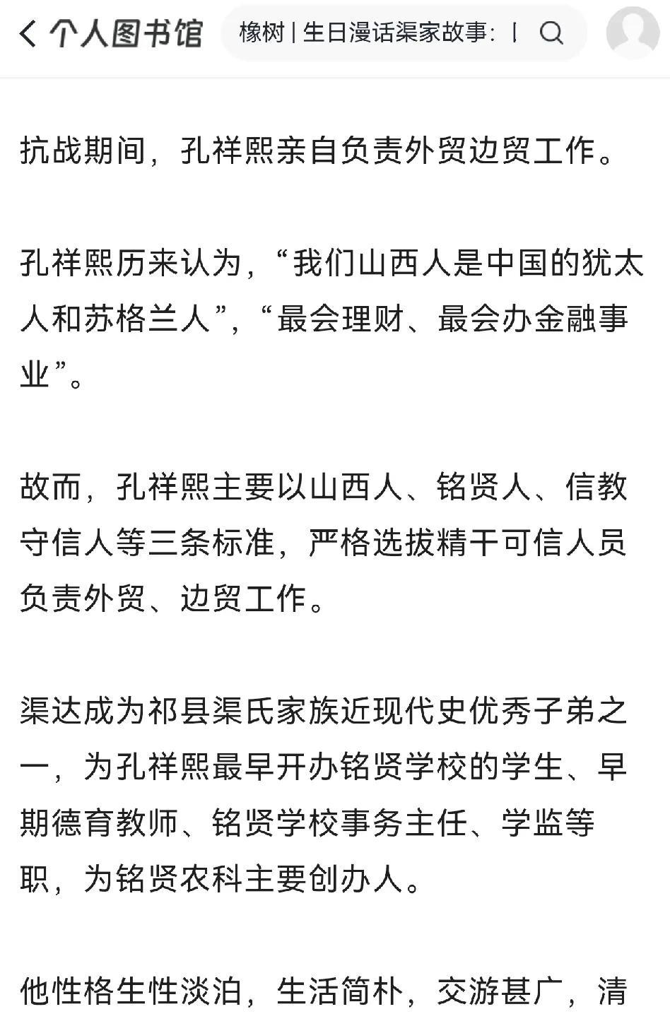 粉丝投稿:深挖了一下挺乌又挺以的网络大V“流浪橡树”的底细。橡树的先祖叫渠达成(见图2),是国民党反动派、四大家族之一孔祥熙的乡党,当年在孔祥熙办的学校当教学总监,也是一名晋商。 你看看,流浪橡树把孔祥熙给吹的,简直是百年不遇的栋梁人才,然而实际上孔祥熙却是大肆吸食民脂民膏民国买办政府的核心成员(长期主政国民政府财政)、压在旧中国老百姓头上三座大山的典型代表之一。 孔祥熙都能被吹成百年栋梁,也是为难他了。俺可是很清楚,孔祥熙的女儿拔枪怒射龙云儿子,结果打死打伤好几个围观群众。教出如此飞扬跋扈的儿女,怎么可能是为国为民的国之栋梁呢?