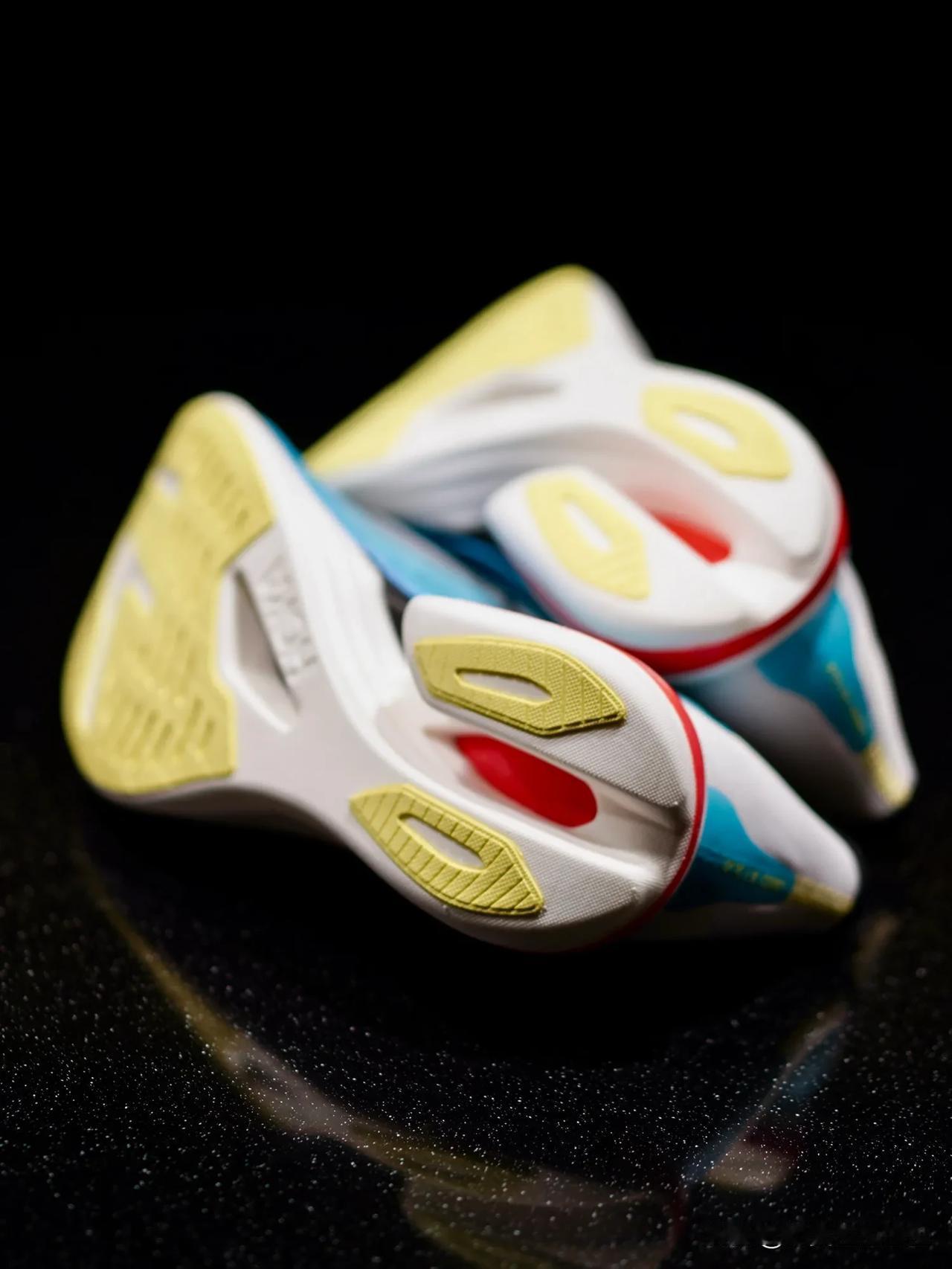 双密度PEBA尼龙发泡泡棉,上层更软,下层偏硬。官方数据离地高度32-39mm,7mm坡差,不过和无后跟的美津浓Wave Rebellion Pro相似,也是合法利用了国际田联的测量规则,实际最高离地点接近50mm。