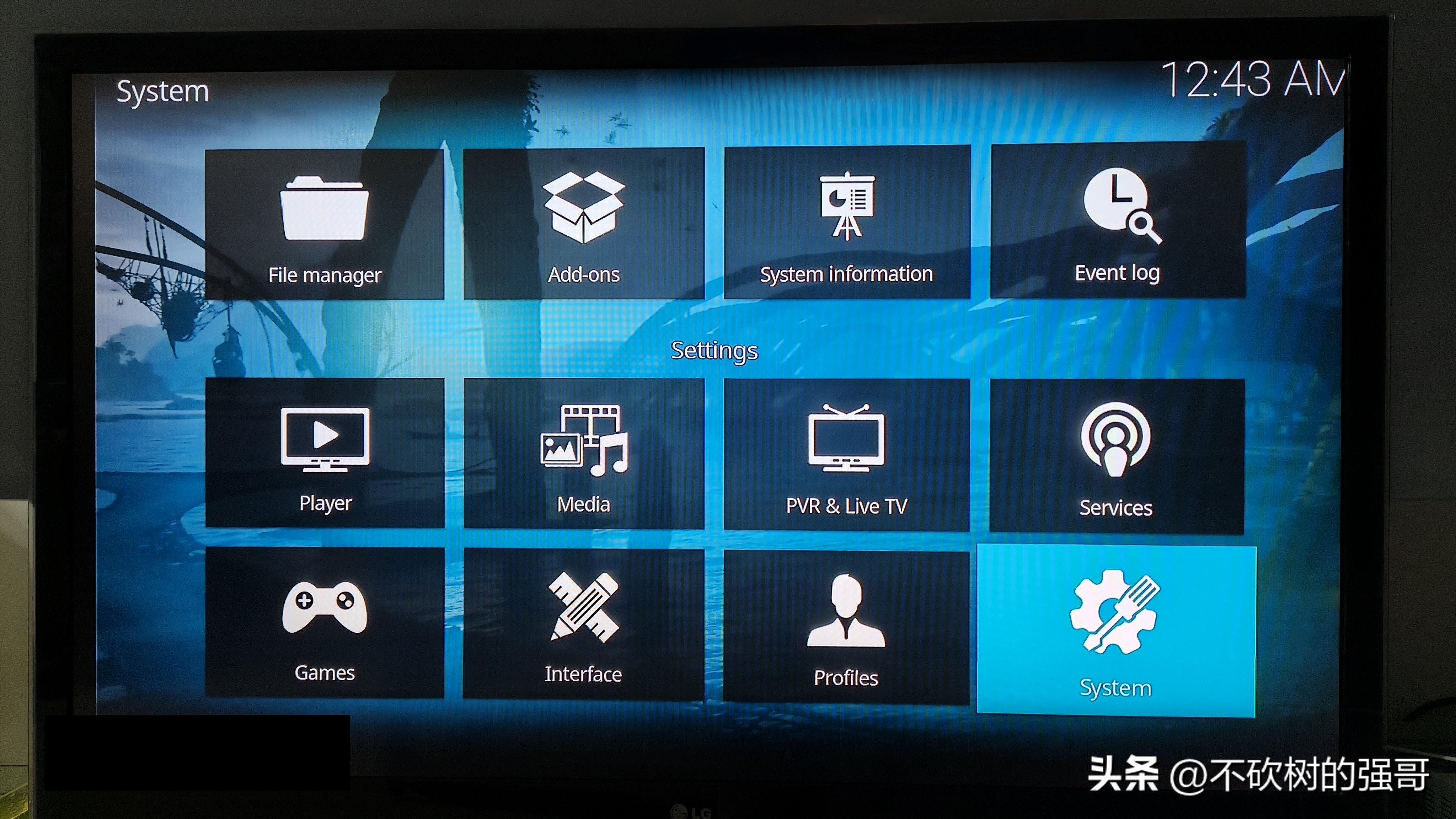 KODI设置:网络机顶盒中安装KODI,然后找到齿轮图标,进入系统设置,