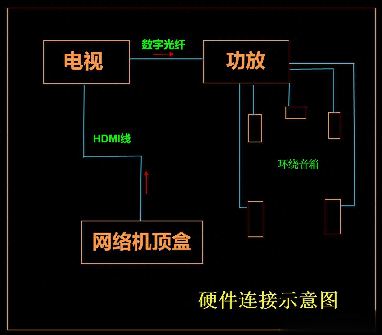 连线很简单,机顶盒通过HDMI线连接到电视的HDMI接口,然后用数字音频光纤线连电视后面的光纤输出接口到功放的光纤接口。这种连接方式的好处是,不需要功放的时候,只要关闭功放电源就可以,不影响电视收看,但如果你把网络机顶盒的HDMI线连接到功放,然后功放再输出连接到电视,就必须开着功放才能看电视。