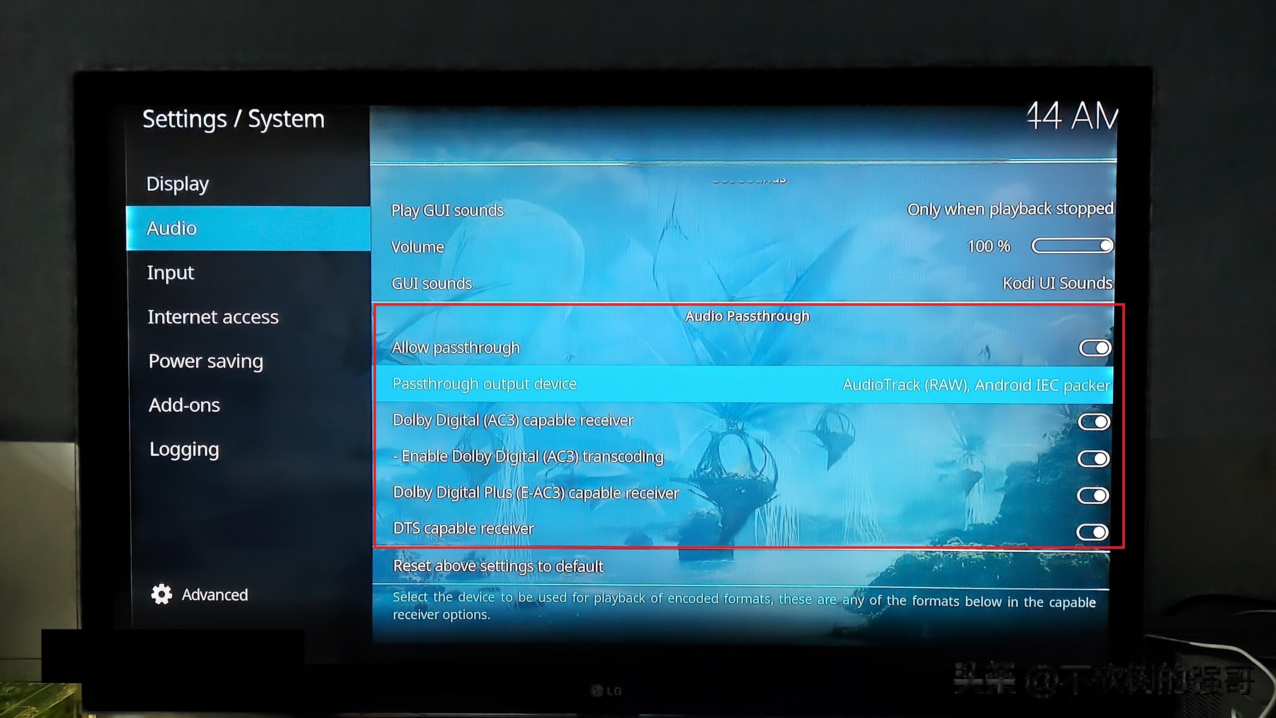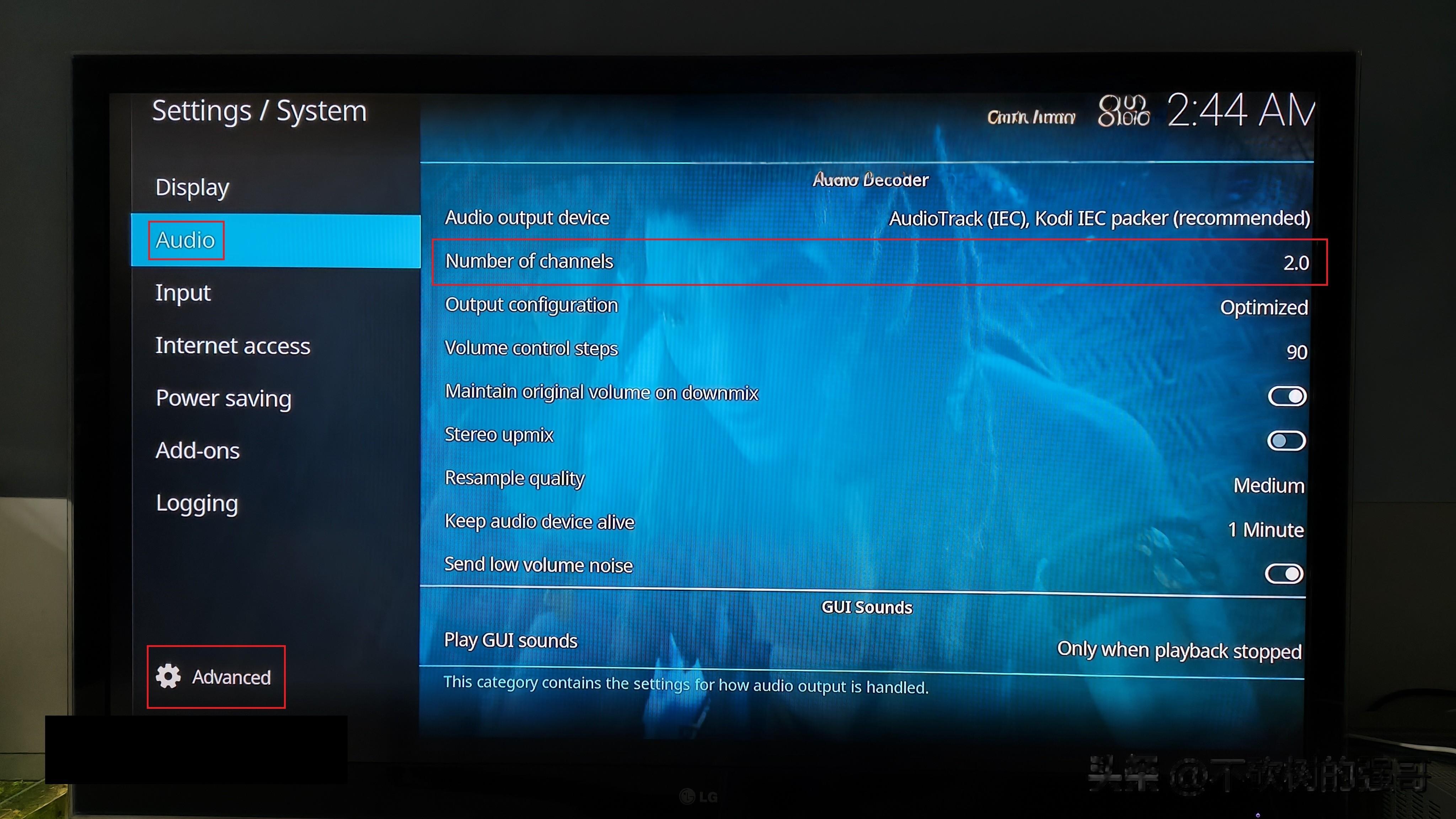 然后左边找到Audio设置,右边的number of channels一定要设置成2,这是因为遇到AAC编码的多声道音频,我的功放是不能解码的(新出的功放不知道能不能),设置成2后,KODI发现编码是AAC格式,它会把AAC格式重新编码为杜比编码并发送给功放,如果这里设置成5.1,它认为你的功放能解码AAC格式就不会重新打包了,这是智能体告诉我的。